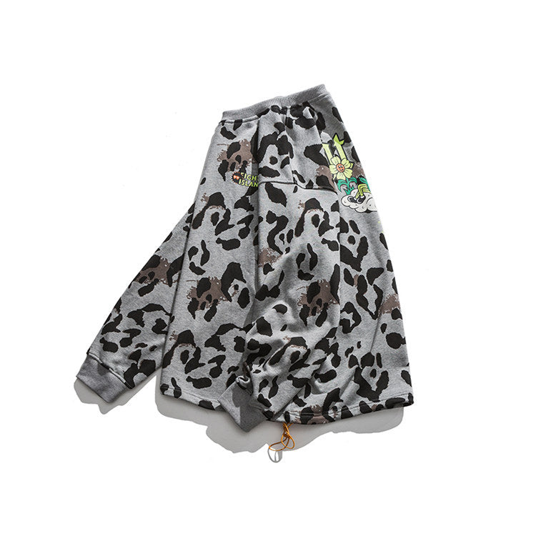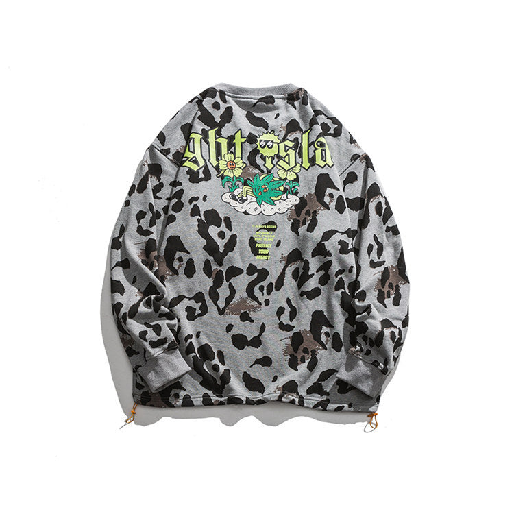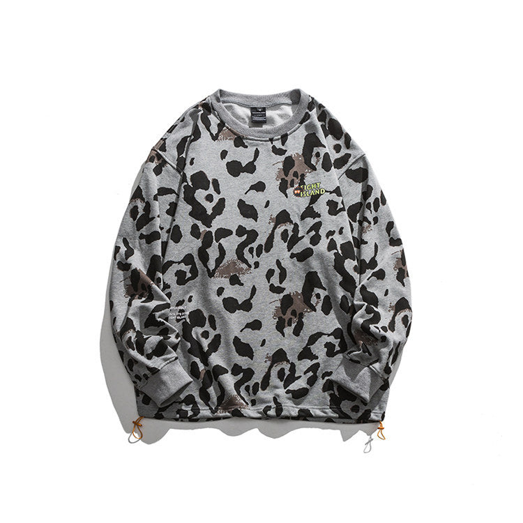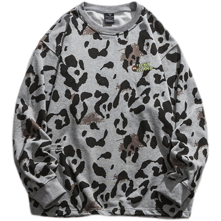 Men Shacket Long Sleeve Autumn Shirt Autumn Monochrome Leopard Print Loose Round Neck Youth Sweater