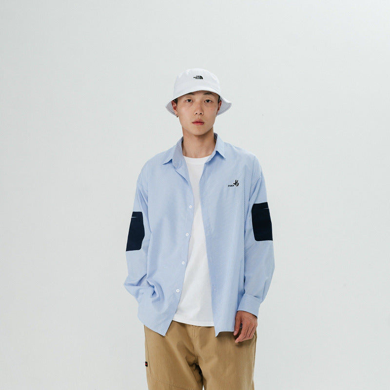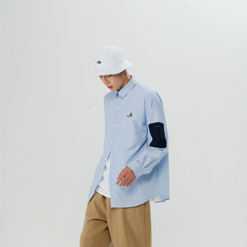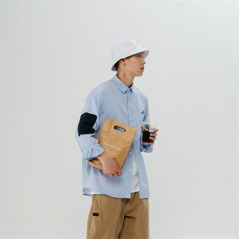 Men Shacket Long Sleeve Autumn Shirt Loose Long Sleeve Striped Embroidered Lapel Shirt for Men