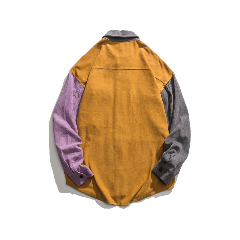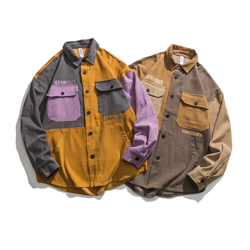 Men Shacket Long Sleeve Autumn Shirt Autumn Leisure Simple Color Stitching Turnover Neck Embroidered Jacket
