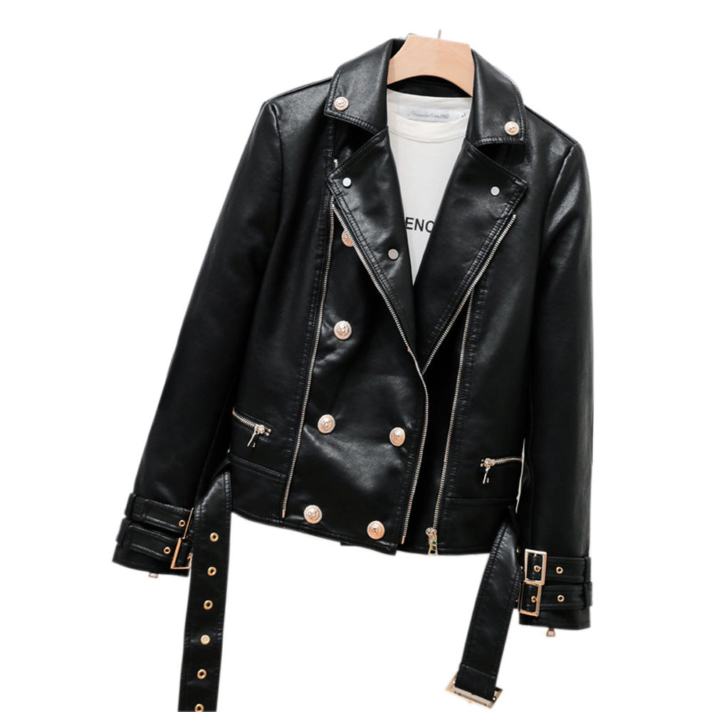 Studded Jackets Lapel Belt Double-Breasted Zipper Heavy Industry PU Leather Coat Short Biker's Leather Jacket