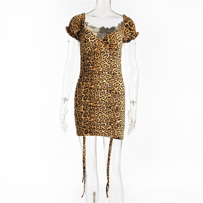Drawstring Tight Sexy Low-Cut Square Collar Leopard Print Dress