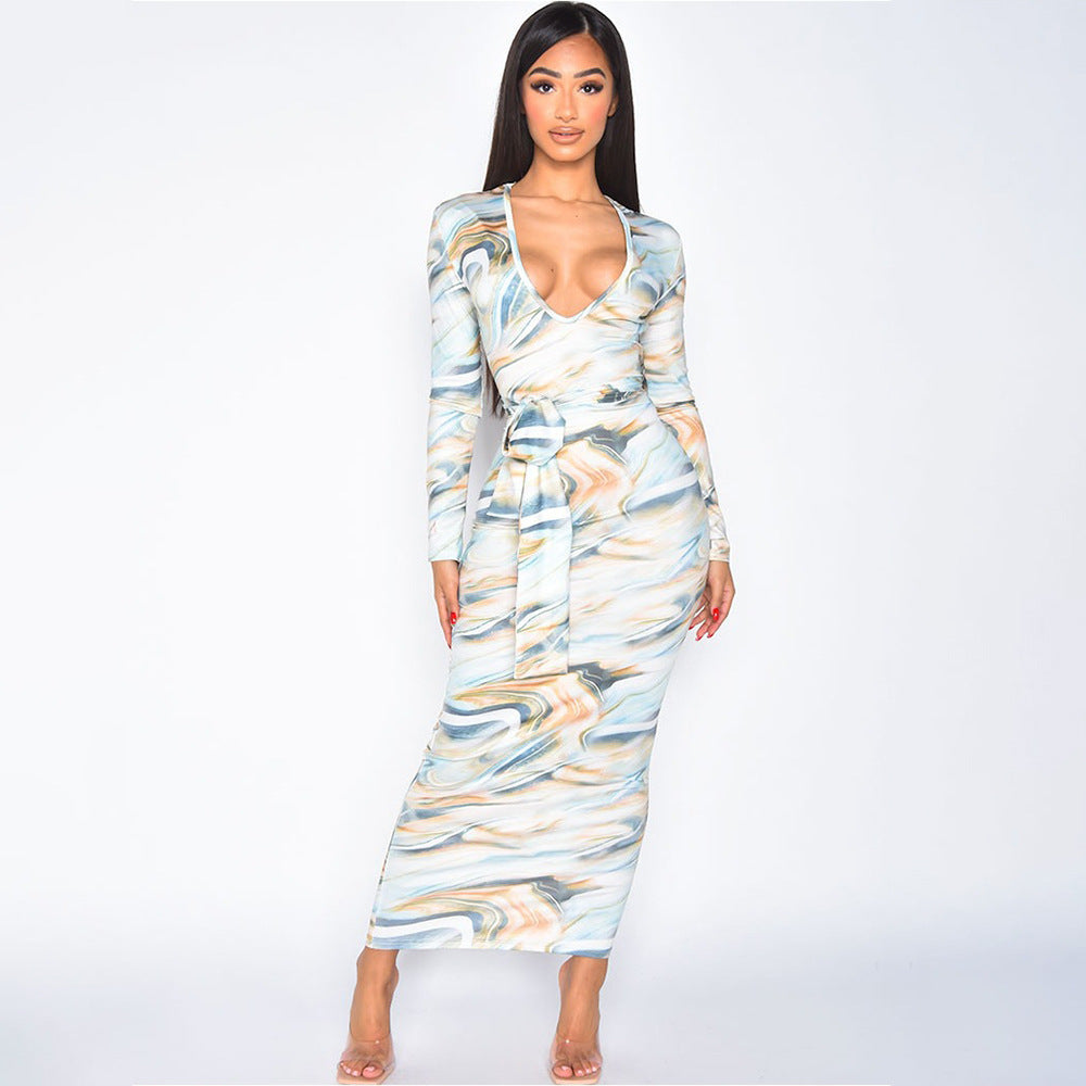 Drawstring Tight Homecoming Dresses Autumn Tight Long Sleeve Printed Dress
