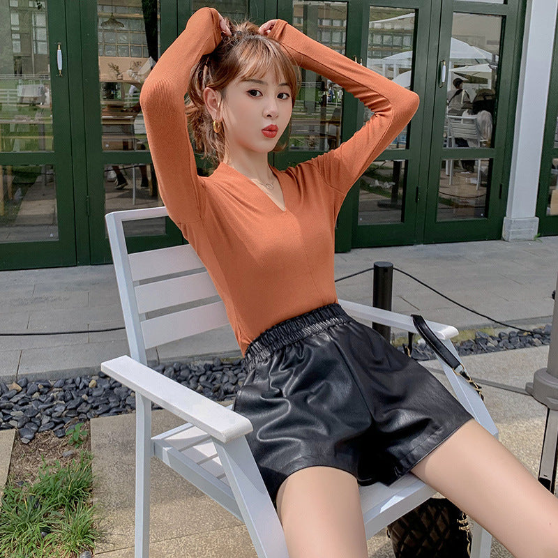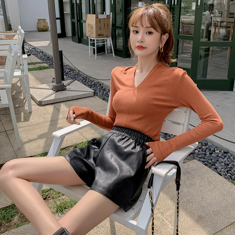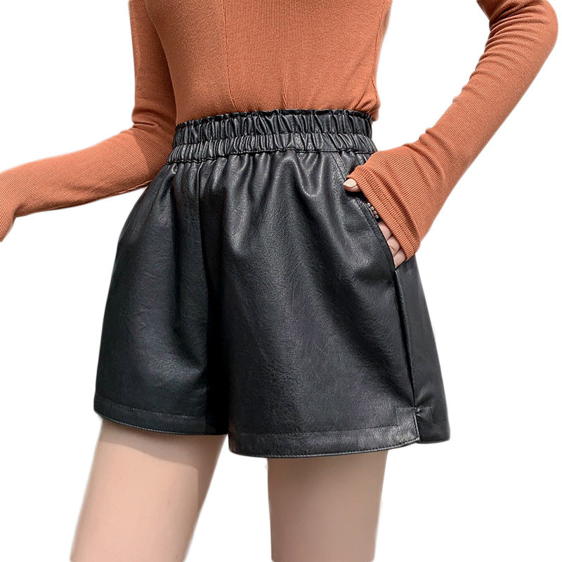 Leather Shorts Autumn and Winter Elastic High Waist A- line Loose Split Wide Leg PU Leather Shorts
