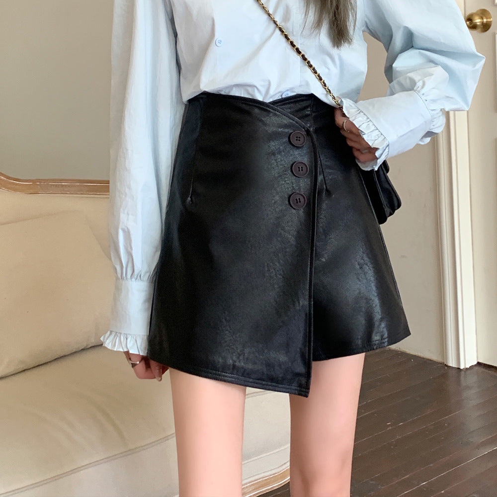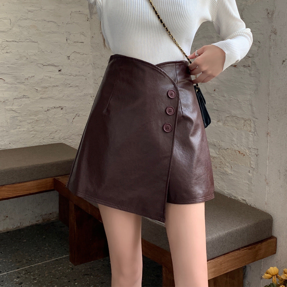 Leather Shorts Irregular Leather Skirt Skirt Design Pantskirt Women's Autumn and Winter Leather Pants High Waist Leather Shorts