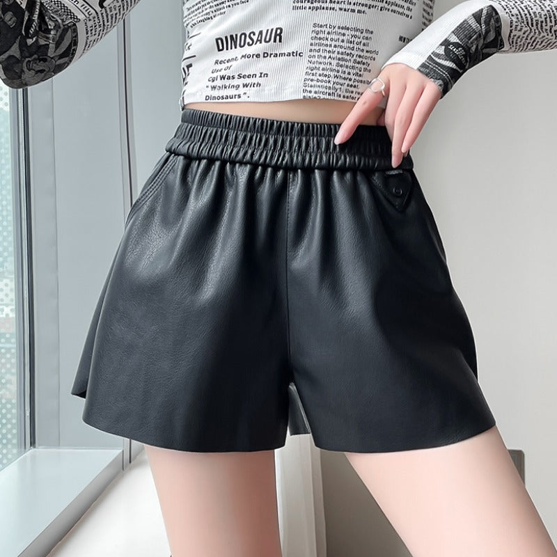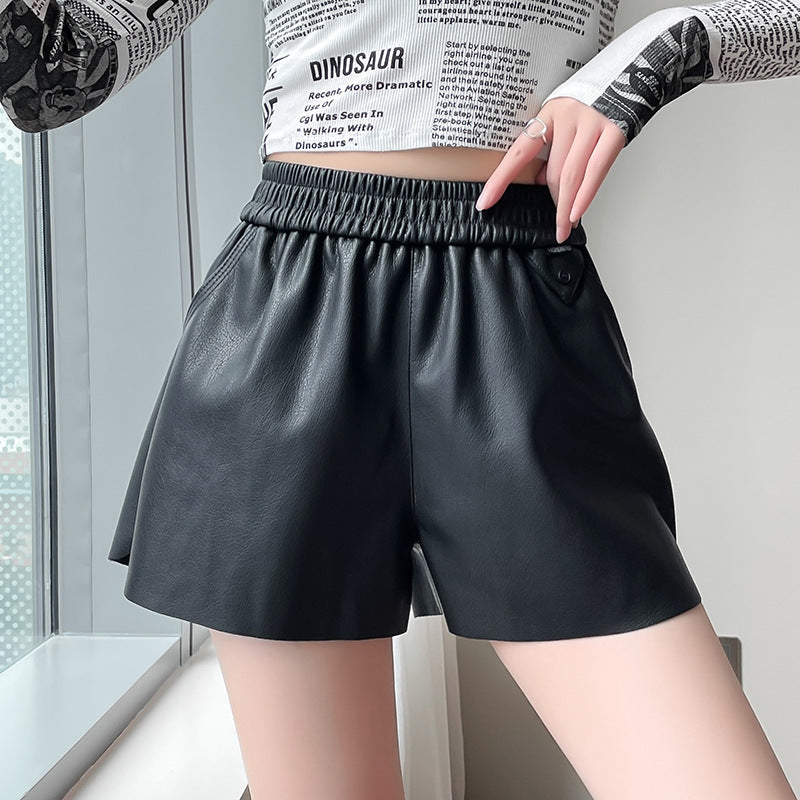 Leather Shorts Elastic Waist Pu Women's Autumn and Winter A- line Loose Wide Leg Pants Outer Wear Casual Boot Pants