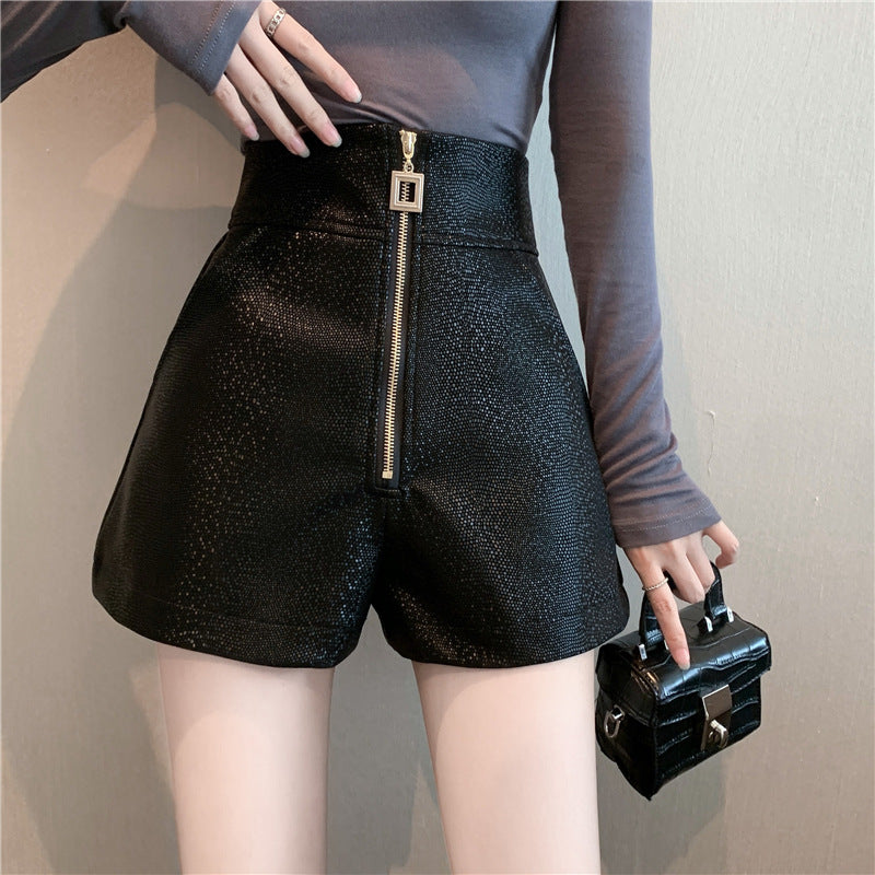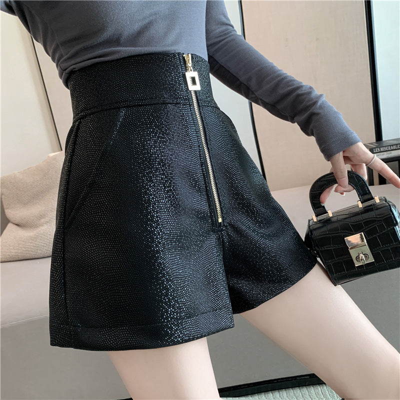 Leather Shorts Autumn Zipper High Waist Wide Leg Pants Outer Wear PU Leather Pants