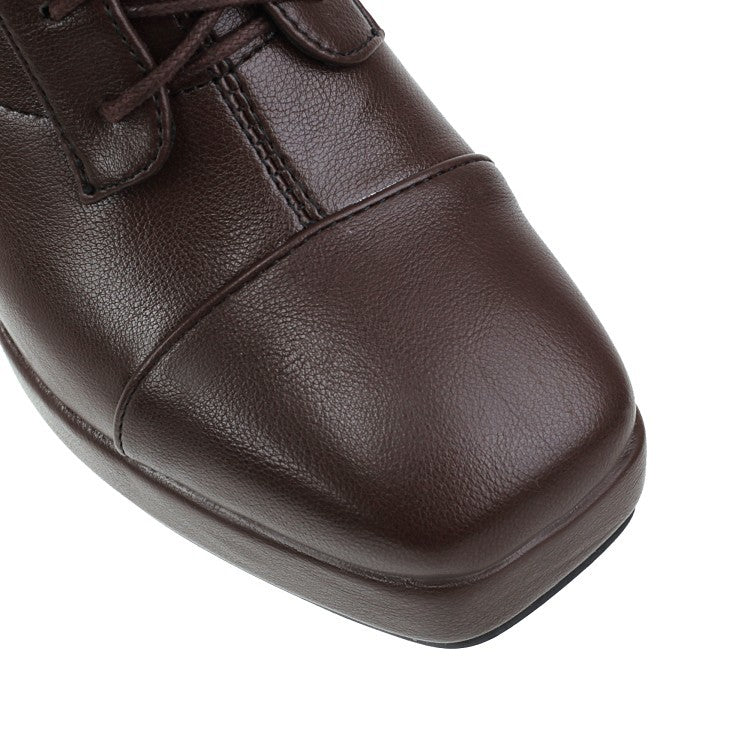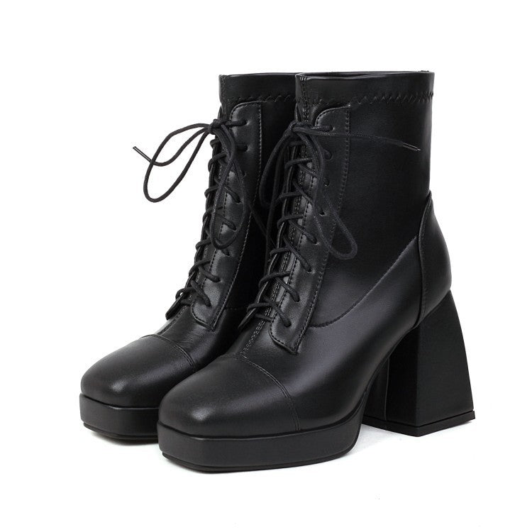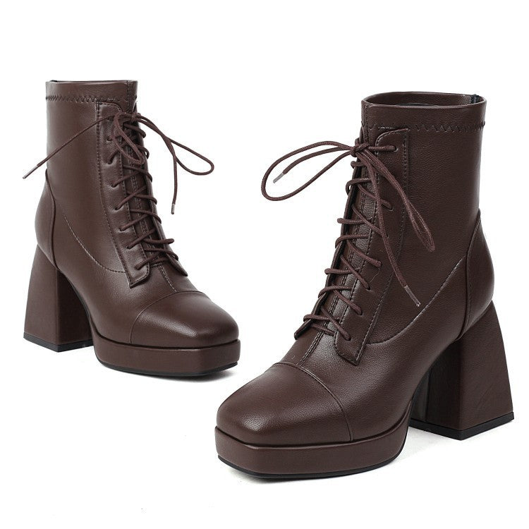 Coachella Festival Boots Spring Square Toe Laces Solid Color Waterproof Platform Thick Heel High Heel Short Boots