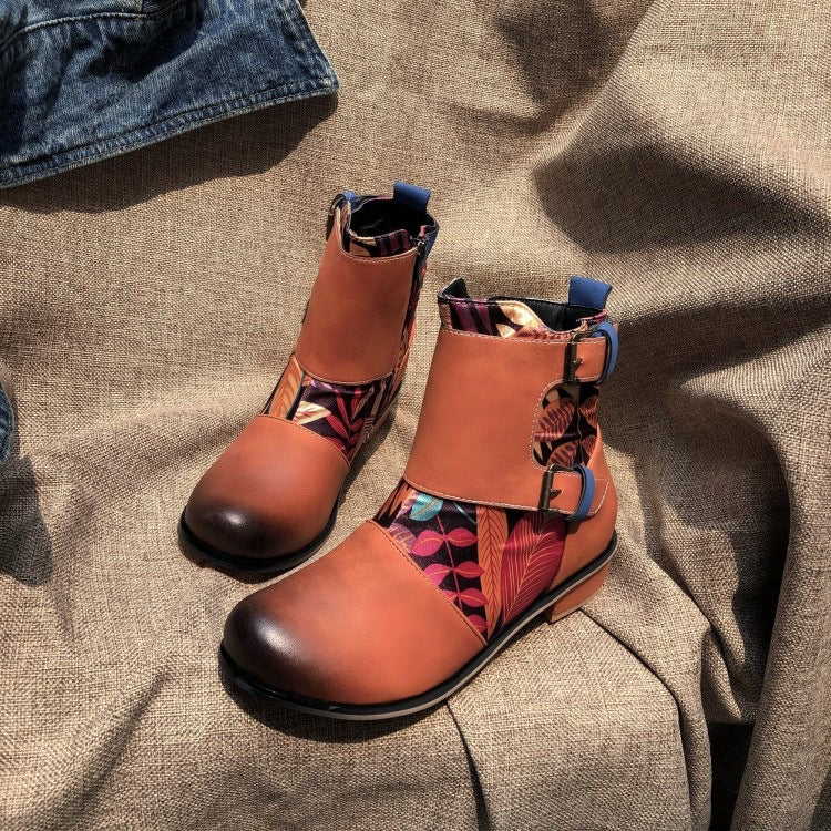 Coachella Cowboy Boots Autumn and Winter Stitching Floral Retro Fashionable Chunky Heel Plus Size Martin Boots