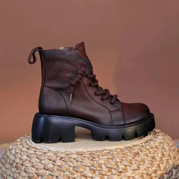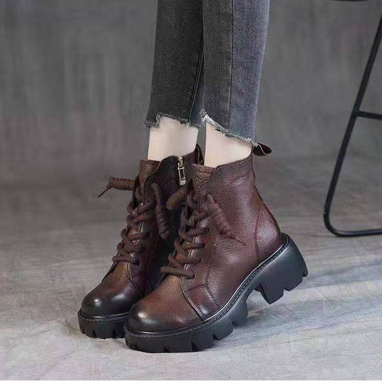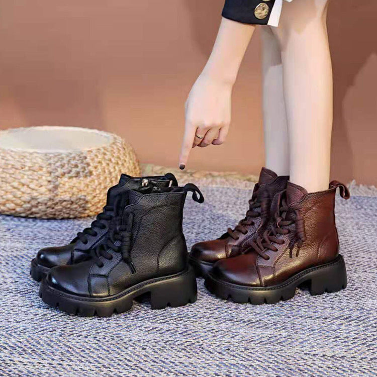 Coachella Cowboy Boots Vintage Low-Cut Lace Up Chunky Heel Autumn and Winter Leather Ankle Boots